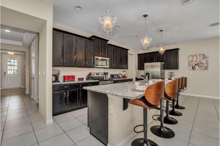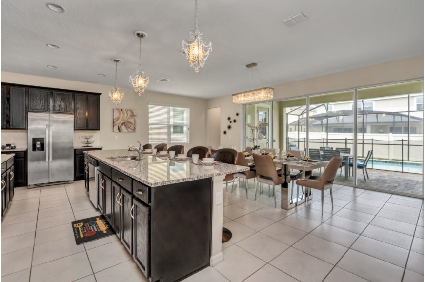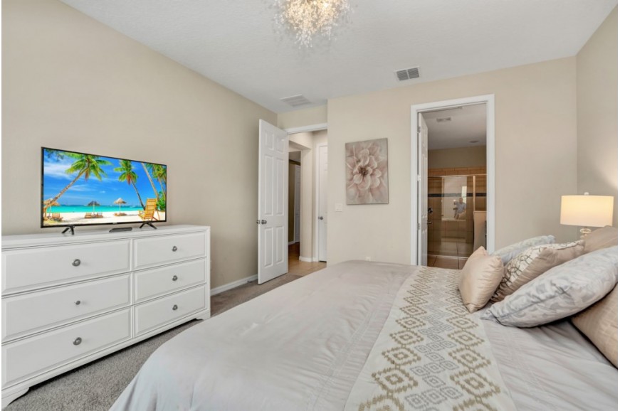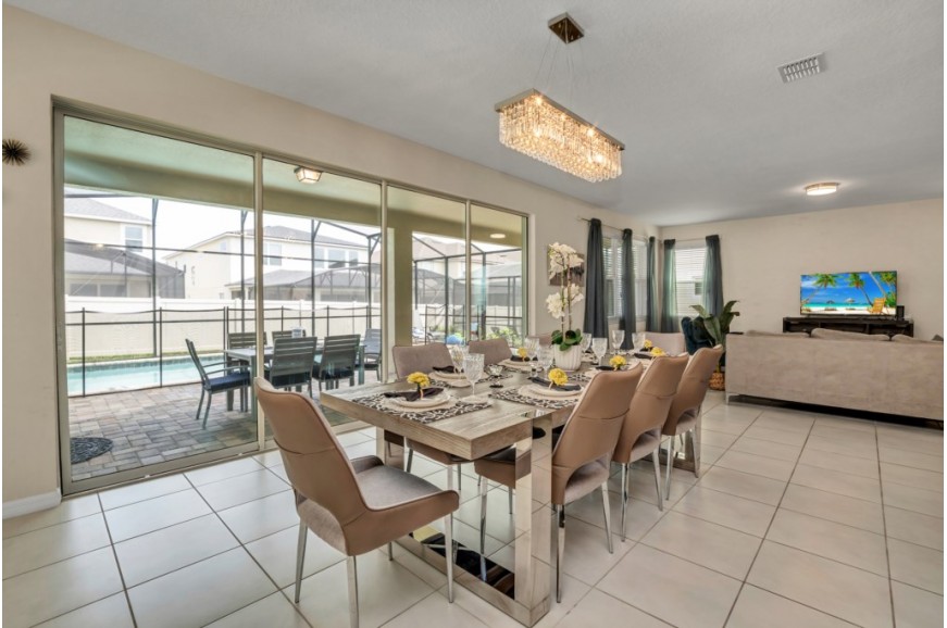 Solara Resort - Kissimmee, Florida is an upscale community currently under development just 7 miles from Walt Disney World. This gated resort community sits nestled just outside of Orlando, Florida. During your stay, you will enjoy this well-appointed home that has been designed and decorated to provide you and your family an abundance of luxury amenities and leaves you well equipped to vacation with all the usual items you would expect to find at home. The resort is only a 30-minute drive from the Orlando International Airport and is situated central to all of Orlando’s famous attractions. The resort boasts an expansive clubhouse which includes a grand pool, complete with surfing simulator, cabanas, pool bar, children's playground, sand volleyball court, basketball court, and soccer field. Inside the clubhouse sits the lounge, bar & grill, fitness center, business center, and sundries store. This spacious 5 bedroom holiday villa can comfortably accommodate a larger family or group of up to 10 people.