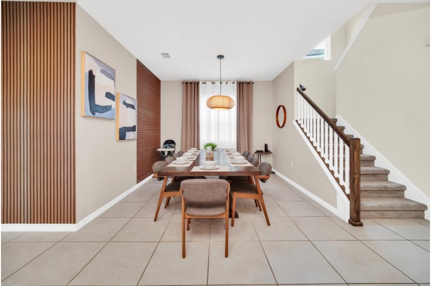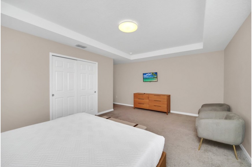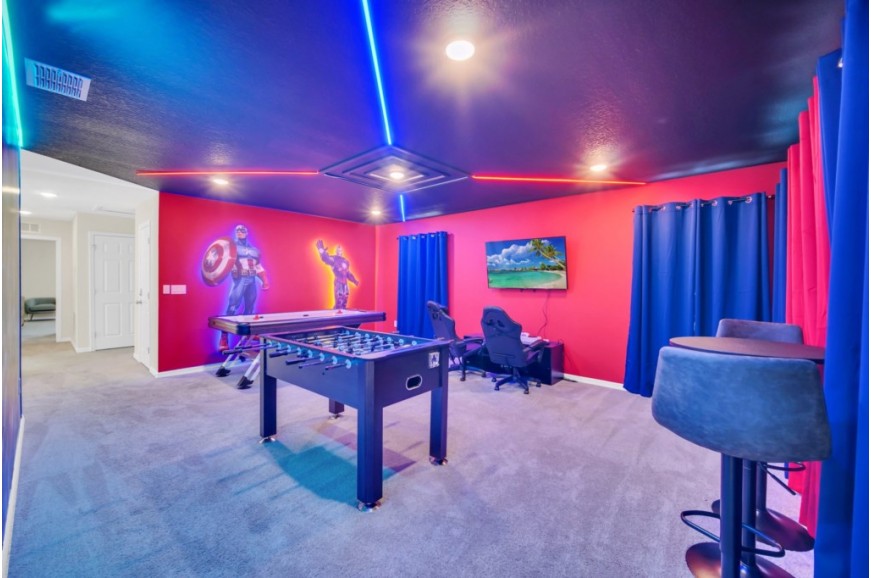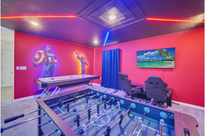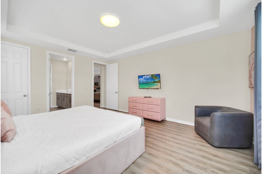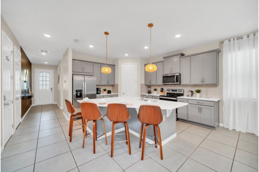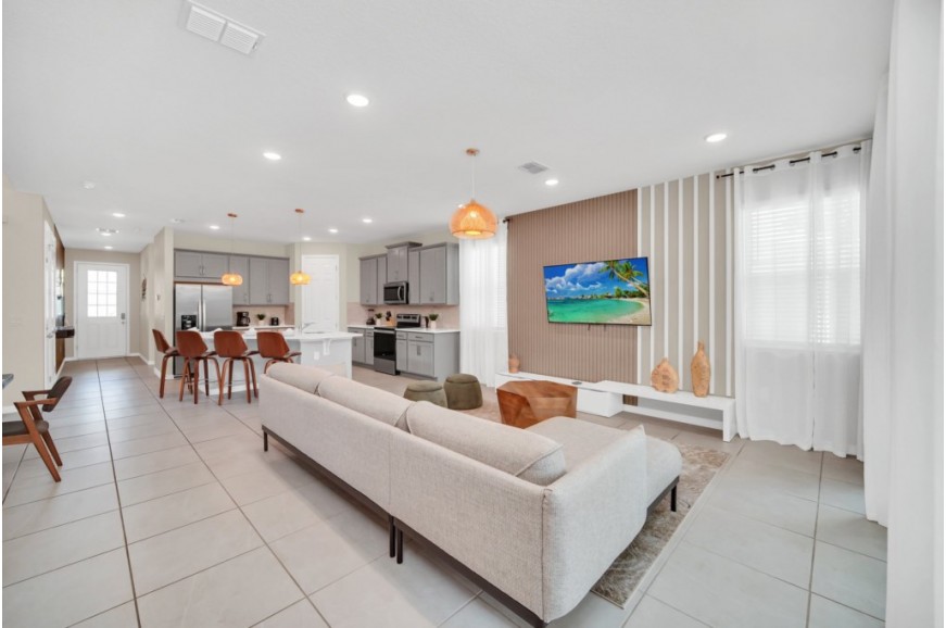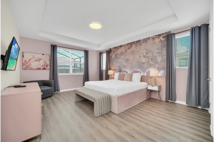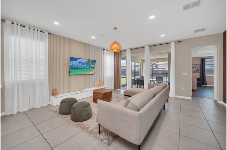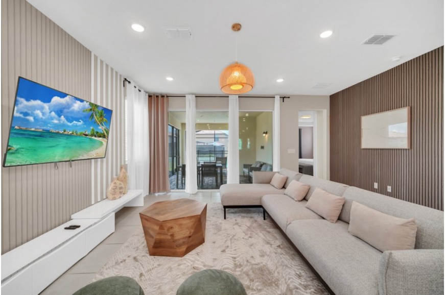 Solara Resort - Kissimmee, Florida is an upscale community currently under development just 7 miles from Walt Disney World. This gated resort community sits nestled just outside of Orlando, Florida. During your stay, you will enjoy this well-appointed home that has been designed and decorated to provide you and your family with an abundance of luxury amenities and leaves you well-equipped to vacation with all the usual items you would expect to find at home. The resort is only a 30-minute drive from the Orlando International Airport and is situated central to all of Orlando’s famous attractions. The resort boasts an expansive clubhouse that includes a grand pool, complete with a surfing simulator, cabanas, pool bar, children's playground, sand volleyball court, basketball court, and soccer field. Inside the clubhouse sits the lounge, bar & grill, fitness center, business center, and sundries store. This spacious 7-bedroom holiday villa can comfortably accommodate a larger family or group of up to 14 people.