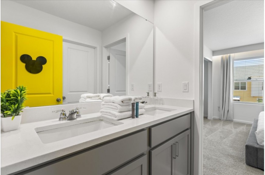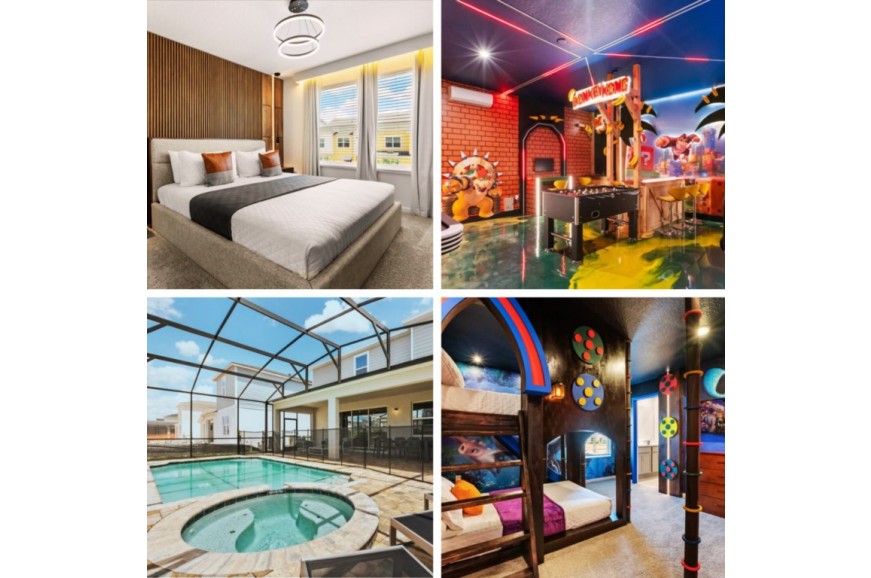 Solara Resort - Kissimmee, Florida, is an upscale community currently under development just 7 miles from Walt Disney World. This gated resort community sits nestled just outside of Orlando, Florida. During your stay, you will enjoy this well-appointed home that has been designed and decorated to provide you and your family an abundance of luxury amenities and leaves you well equipped to vacation with all the usual items you would expect to find at home. The resort is only a 30-minute drive from the Orlando International Airport and is situated central to all of Orlando’s famous attractions. The resort boasts an expansive clubhouse which includes a grand pool, complete with surfing simulator, cabanas, pool bar, children's playground, sand volleyball court, basketball court, and soccer field. Inside the clubhouse sits the lounge, bar & grill, fitness center, business center, and sundries store. This spacious 9 bedroom holiday villa can comfortably accommodate a larger family or group of up to 18 people.